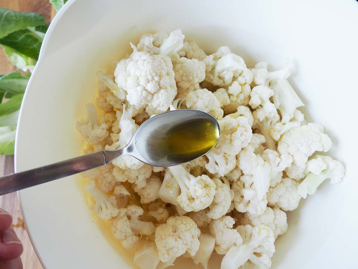 - Röschen in eine Schale geben, gründlich mit dem Olivenöl, Salz, Pfeffer und optionalen Zutaten vermischen, so dass der Blumenkohl überall mit Öl und Gewürzen bedeckt ist.